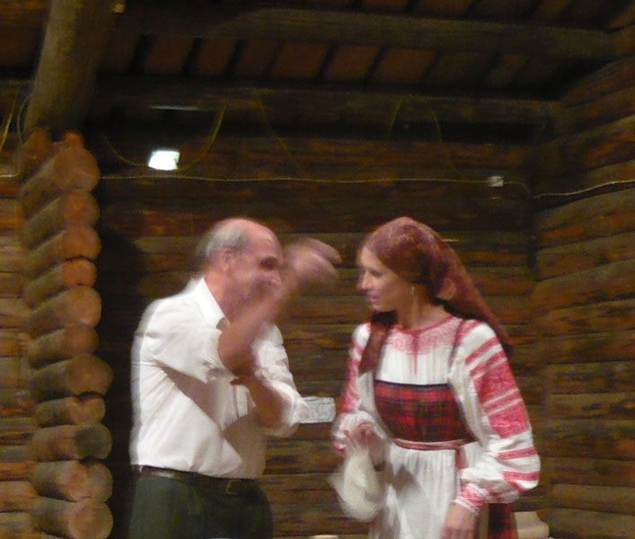 Нам рассказали , что каждое место в крестьянской избе имело свое назначение, и я искренне огорчилась , узнав , что, пропуская всех гостей в избу , которые усаживались в красный угол, сама заняла место кикиморы, в другой избе это почетное место досталось Владимиру Валентиновичу и Владимиру Ильичу, а Юрий все время мостился на лавку для нищих. Поэтому когда нас привели в дом охотника, то Владимир Валентинович заторопился под образа , а мы, довольные , расположились на лавке для гостей под медвежьей шкурой, предоставив возможность посидеть на лавке для нищих и кикимор другим.