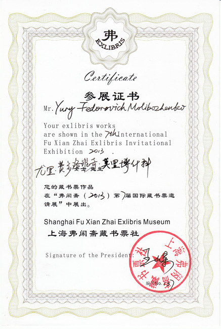 The 7th Fu Xian Zhai Exlibris Invitation Competition and Ex libris Collection Exhibition 2013 . В августе 2013 года в Шанхае состоялась Седьмая Международная выставка экслибриса. В выставке приняли участие художники из разных стран. По итогам выставки был издан прекрасный каталог, который получили все участники , прошедшие квалификационный отбор. На одной из страниц представлены четыре экслибриса Юрия Молибоженко